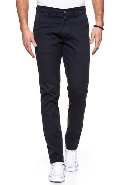 Męskie spodnie materiałowe w ciemnogranatowym kolorze wpadającym w czarny. Model ten charakteryzuje średni stan oraz zwężana nogawka. Na tylnej prawej kieszonce charakterystyczne logo producenta.