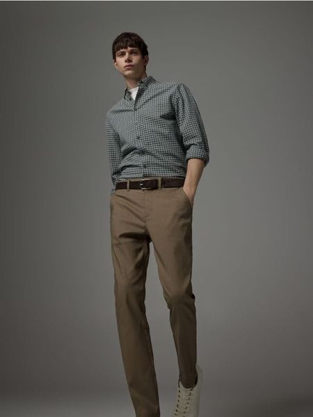Spodnie typu chino, wykonane z tkaniny z dodatkiem wiskozy.