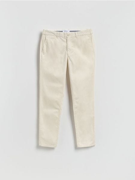Spodnie typu chino o dopasowanym kroju, wykonane z bawełnianej tkaniny.