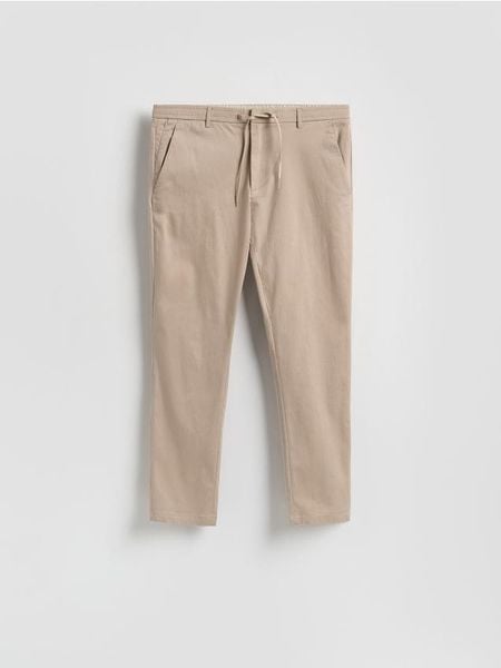 Spodnie typu jogger, wykonane z tkaniny z bawełną.