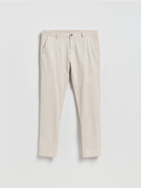 Spodnie typu chino o dopasowanym kroju, wykonane z bawełnianej tkaniny.