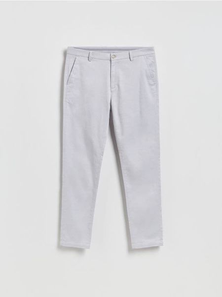 Spodnie typu chino o dopasowanym kroju, wykonane z bawełnianej tkaniny.