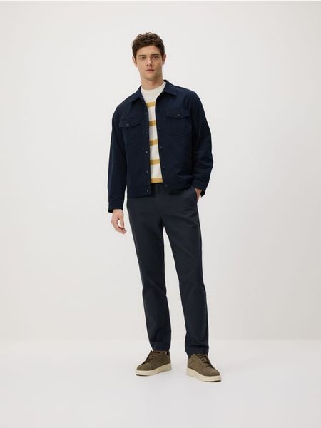 Spodnie typu chino, wykonane z bawełnianej tkaniny.