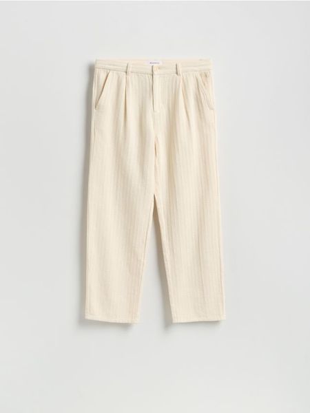 Spodnie o prostym kroju, wykonane ze strukturalnej, bawełnianej tkaniny.