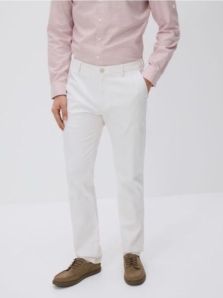 Spodnie typu chino o dopasowanym kroju, wykonane z bawełnianej tkaniny.