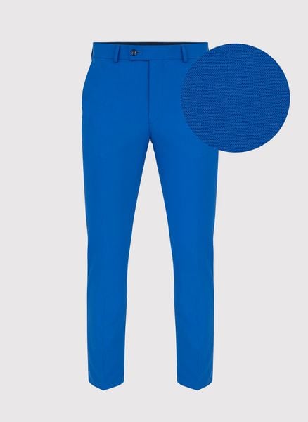 Gładkie niebieskie spodnie garniturowe – Pako Lorente. Niebieskie spodnie formalne. Spodnie w kant. Niebieski garnitur. Fason Slim. Skład poliester, wiskoza.