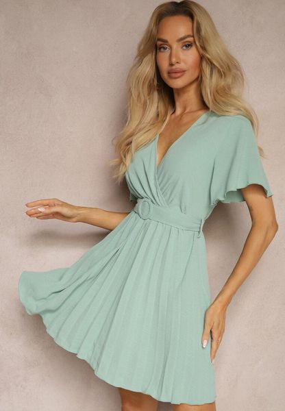 Miętowa Sukienka Plisowana z Paskiem i Kopertowym Dekoltem Azelea