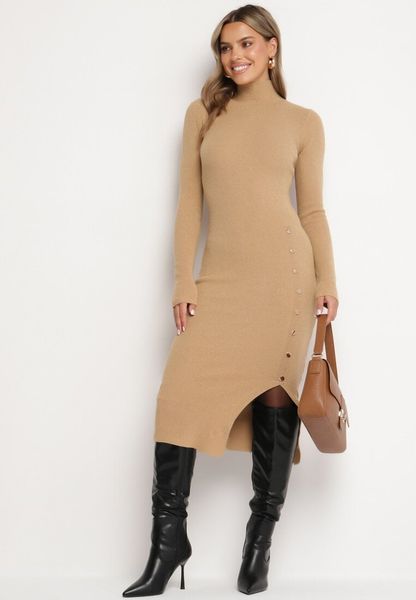 Ciemnobeżowa Sweterkowa Sukienka Dopasowana z Wiskozą Modalem i Ozdobnymi Guzikami Gemifra