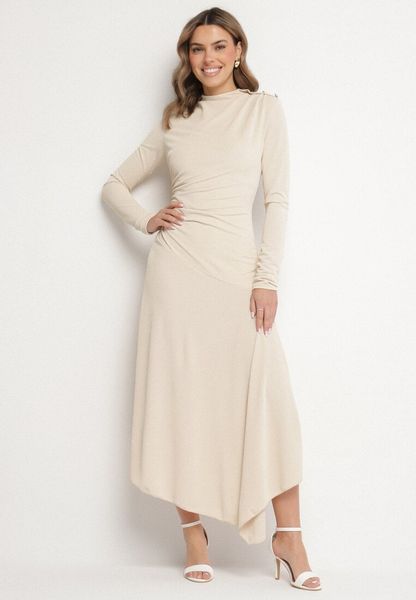 Beżowa Koktajlowa Sukienka o Asymetrycznym Kroju Ozdobiona Guzikami Nolriti