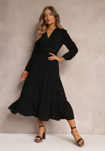 Czarna Sukienka Rozkloszowana z Falbanką i Koronką Kiaya