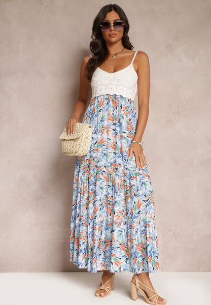 Niebieska Kwiecista Sukienka Maxi z Szydełkową Górą i Cienkimi Ramiączkami z Wiskozy Zanidora