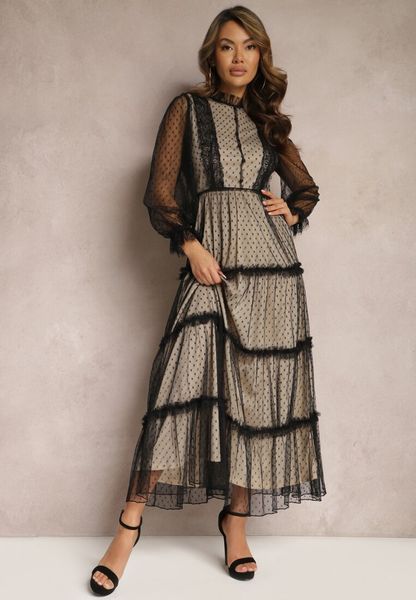Beżowo-Czarna Tiulowa Sukienka Maxi ze Wstawkami z Koronki i Ozdobnymi Guzikami Aovena