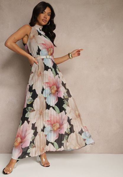 Czarna Plisowana Sukienka z Wiązaniem i Paskiem z Klamrą Nitolia