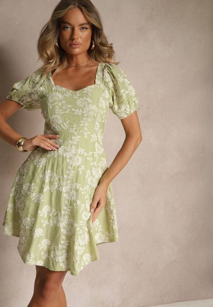 Zielona Sukienka w Kwiaty z Bufiastymi Rękawami Deviriel