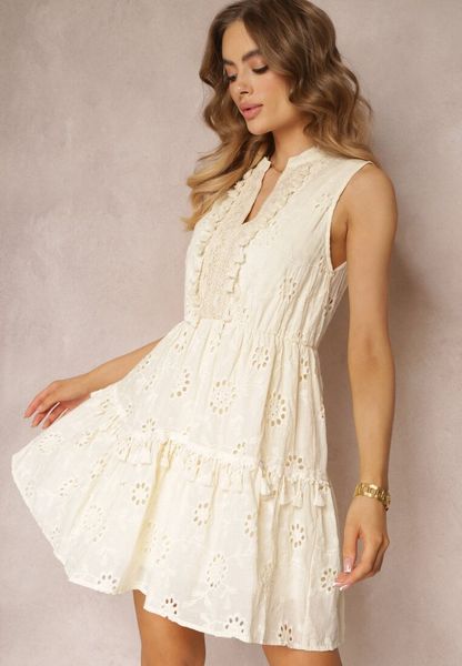 Rozkloszowana sukienka Inetake bez rękawów o długości mini. W pasie wszyta gumka, która po rozciągnięciu ma wymiary: 93 cm (S/M) i 97 cm (L/XL). Dół lekko rozkloszowany z falbanką. Wyróżnia się ozdobnym dekoltem. Posiada elastyczną podszewkę. Idealna na sezon wiosna/lato.