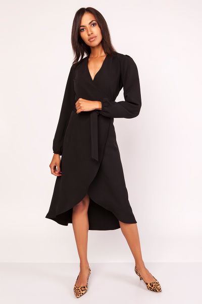 Czarna Asymetryczna Sukienka Kopertowa z Wiązanym Paskiem