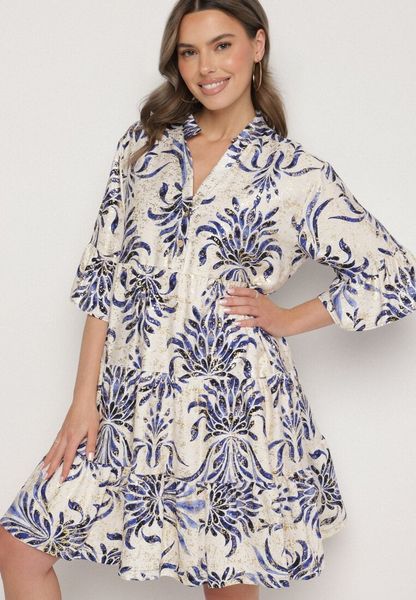 Niebieska Wiskozowa Sukienka o Rozkloszowanym fasonie z Metalicznym Nadrukiem Aurasana