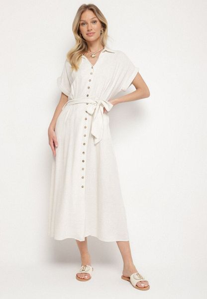 Jasnobeżowa Sukienka Koszulowa z Wiskozy i Lnu Wiązana w Talii z Kieszeniami Efrasira