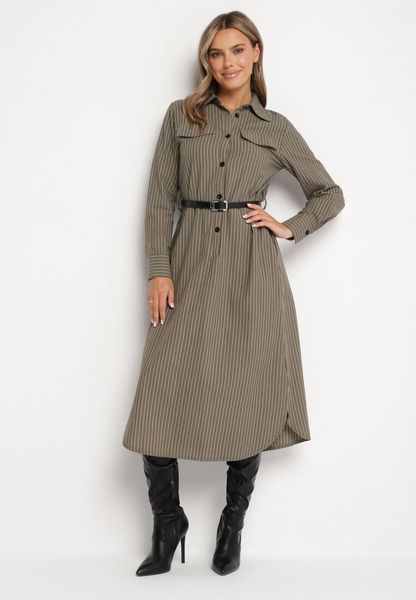 Zielona Koszulowa Sukienka na Guziki z Paskiem i Imitacją Kieszeni Tintarra