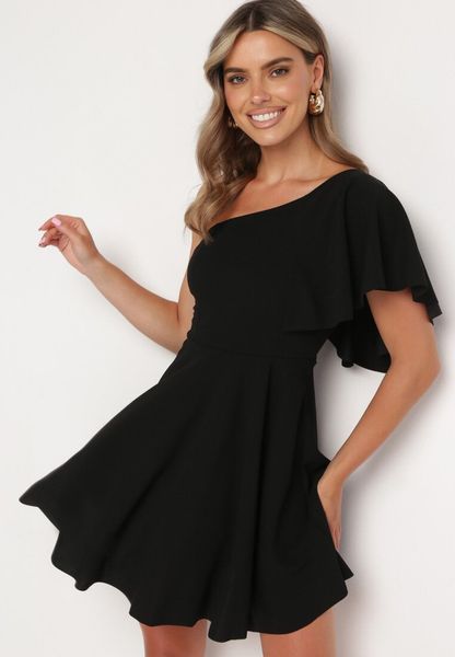 Czarna Sukienka o Rozkloszowanym Kroju z Asymetryczną Górą na Jedno Ramię Ulubia