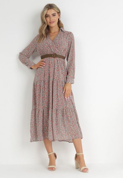Różowa Sukienka Rozkloszowana w Kwiaty z Paskiem Khito