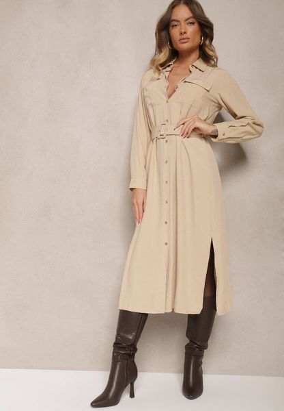 Beżowa Wiskozowa Sukienka o Koszulowym Kroju z Paskiem z Klamrą i Kieszeniami Lisavianna