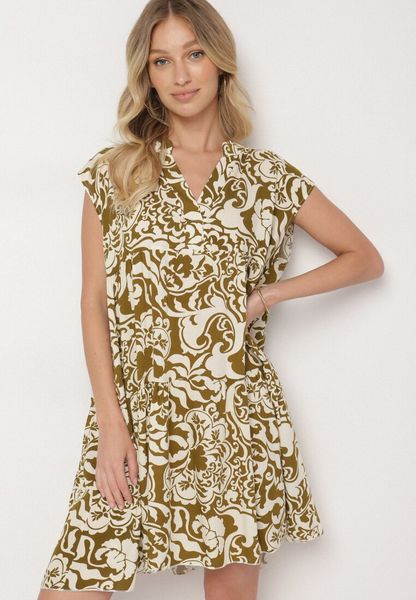 Ciemnozielona Sukienka z Wiskozy o Rozkloszowanym Kroju w Abstrakcyjny Wzór Lirese