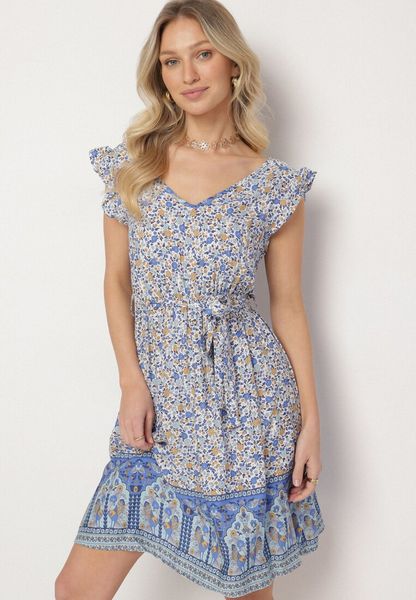 Niebieska Wiskozowa Sukienka o Rozkloszowanym Kroju Wiązana przy Dekolcie Tilvessa