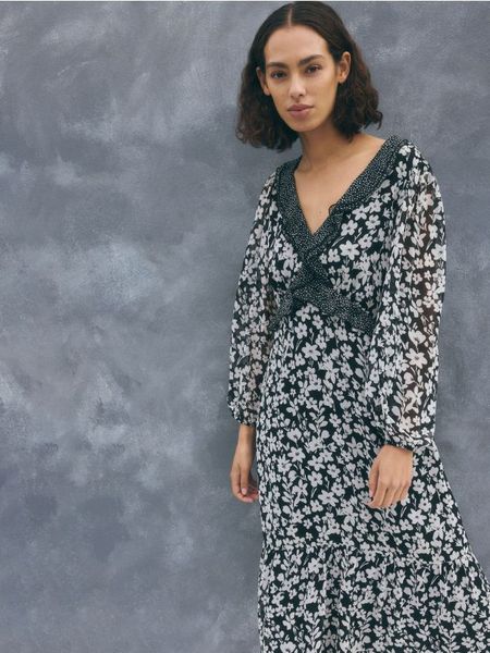 Sukienka o rozkloszowanym kroju, wykonana z żorżetowej tkaniny.