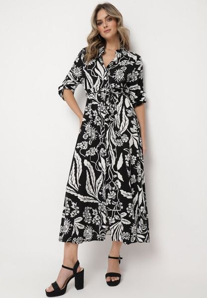 Czarno-Biała Koszulowa Sukienka z Roślinnym Wzorem z Wiązanym Paskiem Rosallen