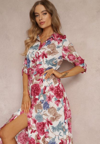 Biała Sukienka Koszulowa z Rozcięciem w Kwiaty Yamone