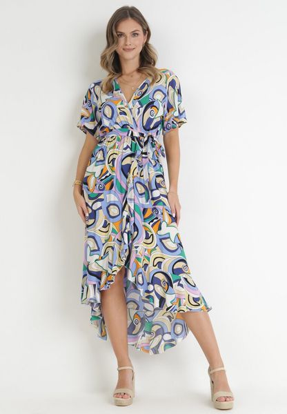 Sukienka Dionienne z krótkimi rękawami i falbanką na dole. Z przodu głęboki, kopertowy dekolt. W pasie wszyta gumka, która po rozciągnięciu ma wymiary: 95 cm (M/L) i 99 cm (XL/XXL). Nie posiada podszewki. Idealna na wiosnę i lato.