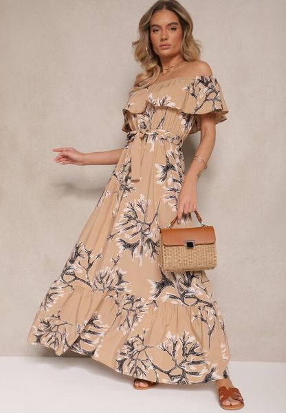 Ciemnobeżowa Sukienka Hiszpanka o Rozkloszowanym Kroju z Wiązanym Paskiem Sesiniela