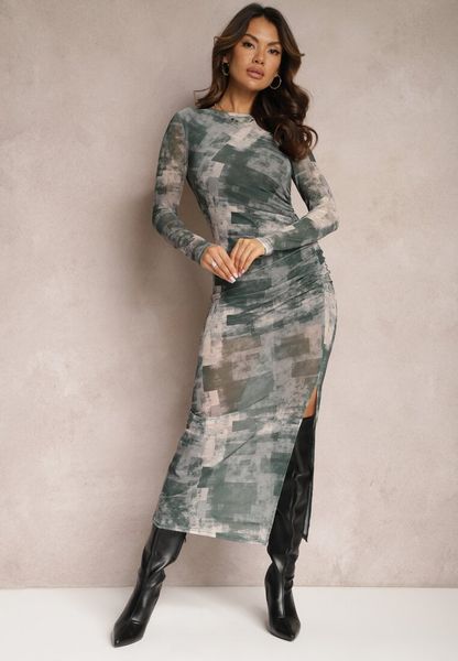 Zielona Dopasowana Sukienka Siateczkowa Maxi z Rozcięciem i Marszczeniem Soininen