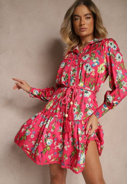 Rozkloszowana sukienka Payten z koronkowymi wstawkami. Górna część zapinana na guziki. W talii delikatny sznurek zakończony frędzlami. Przy płytkim dekolcie stójka, na dole ozdobna falbanka. Koszulowa sukienka Payten wykonana jest z przyjemnego materiału o kwiecistym wzorze, bez podszewki.