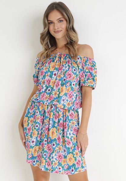 Sukienka Cedrinth wykonana z tkaniny z wiskozy, dekorowanej kobiecym printem w kwiaty. O fasonie hiszpanki, z gumką w pasie. Krótki rękaw w gumkę, z przodu przy dekolcie wiązanie troczkiem Brak podszewki. Gumka w pasie po rozciągnięciu mierzy: M/L – 93 cm, XL/XXL – 99 cm.