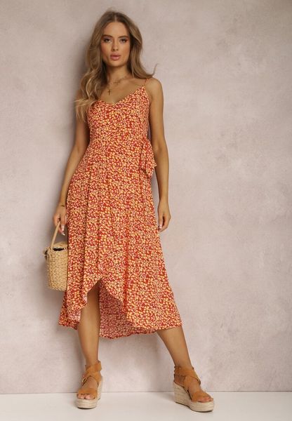 Sukienka damska midi z wiskozy na ramiączkach z motywem kwiatowym czerwona Lamboni 603