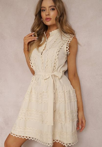 Sukienka Ismeia mini, o kobiecym, lekko rozkloszowanym fasonie. Model bez rękawów, na grubych ramiączkach. Na całej długości dekorowana koronkową tasiemką w dopasowanym kolorze. Przód zapinany na rząd guzików do linii bioder. Dodatkowo zestawiona z wiązanym, materiałowym paskiem w pasie. Sukienka Ismeia skradnie serce każdej wielbicielce stylu boho!