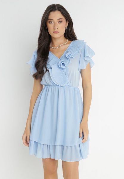 Sukienka Phaenathe rozkloszowana, o długości mini. Krótkie rękawy z falbanek. Głęboki, kopertowy dekolt. Przy dekolcie podwójna, plisowana falbana. W pasie gumka rozciągająca się do 93 cm. Sukienka ma podszewkę w dopasowanym kolorze. Będzie towarzyszyć Ci podczas imprez i wyjść – dobierz do niej sandały na obcasie.