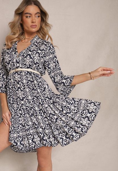 Granatowa Sukienka Koszulowa z Wiskozy Ozdobiona Ornamentalnym Wzorem Hoarna