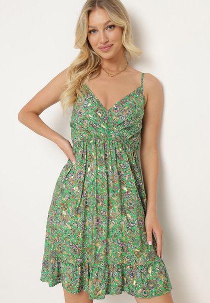 Zielona Wiskozowa Sukienka na Ramiączkach z Kopertowym Dekoltem i Gumką w Pasie Dimiette