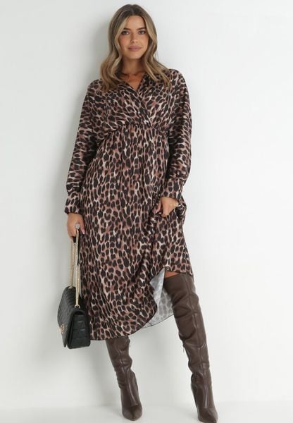 Brązowa Sukienka w Panterkę z Kopertowym Dekoltem Caka