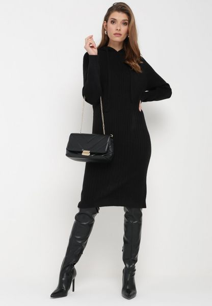 Czarna Wełniana Sukienka z Kapturem w Prążki Tyrwe