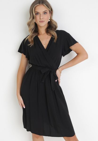 Czarna Rozkloszowana Sukienka z Wiskozą Kopertowym Dekoltem i Materiałowym Paskiem w Talii Jenvia