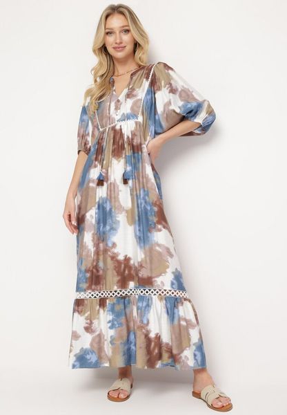 Beżowa Maxi Sukienka Rozkloszowana z Falbankami i Wiązaniem przy Dekolcie Pallam