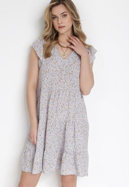 Sukienka Orinilla rozkloszowana, o długości mini. Góra z dekoltem w serek o klasycznej głębokości. Bez rękawów, z falbankami na wysokości ramion. Dekorowana poziomymi odcięciami i falbaną na dole. Pokryta wzorem w minimalistyczne kwiaty. Świetnie komponuje się z trampkami przed kostkę albo ażurowymi balerinami.