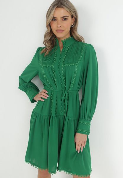Sukienka Zelna o koszulowym fasonie midi w stylu retro. Góra ze stójką, zapinana na guziki, wiązana w pasie, dół z falbanką, rękawy z mankietami. Udekorowana koronkowymi lamówkami i plisowaniem. Bez podszewki.