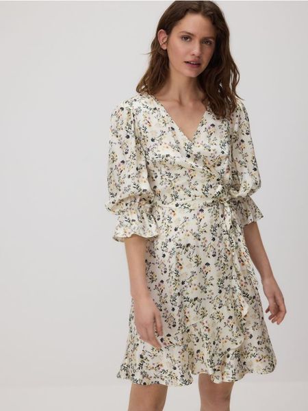 Sukienka o kopertowym fasonie, wykonana z wiskozy.