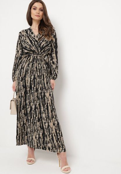 Czarno-Beżowa Sukienka z Paskiem w Talii i Etnicznym Motywem Celestrria