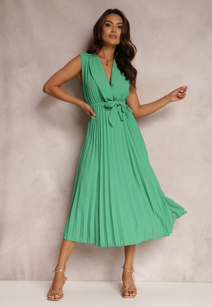Zielona Rozkloszowana Sukienka Midi z Kopertowym Dekoltem i Gumką w Talii Muntani